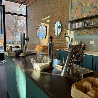 The space feels clean, clutter-free, and open. All-white espresso machines, white quartz countertops, and white walls create a bright, airy atmosphere. An original tin ceiling, a staple of old Chicago buildings, adds character. The front and side brick walls were opened up to install massive windows, flooding the space with natural light. Large glass garage doors cut into the thick brick wall open the cafe directly to Chicago's 606 trail.