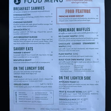 They have a full food menu. We tried out the grilled cheese and tomato basil soup, sausage breakfast sandwich, and biscuits and gravy.